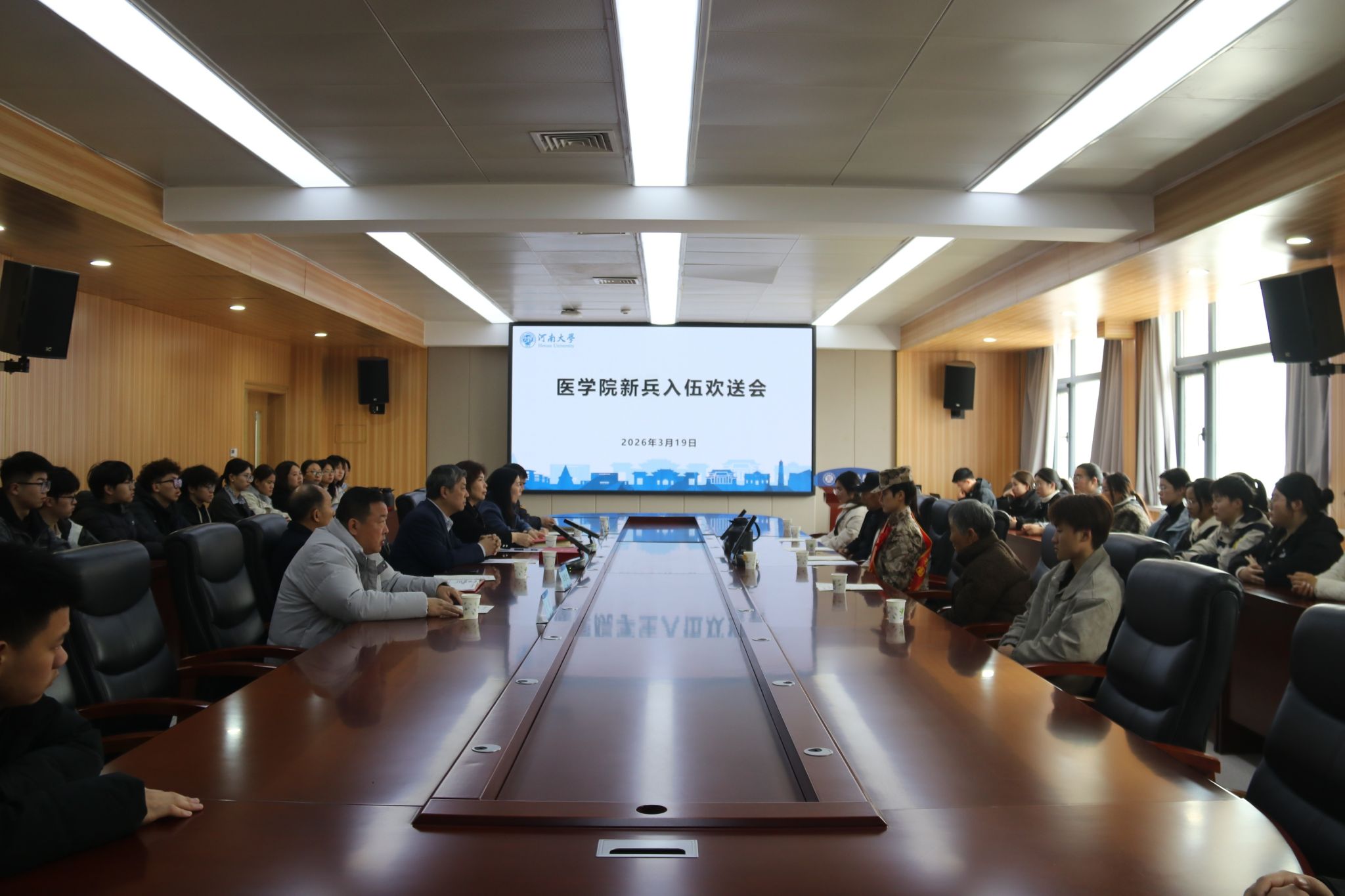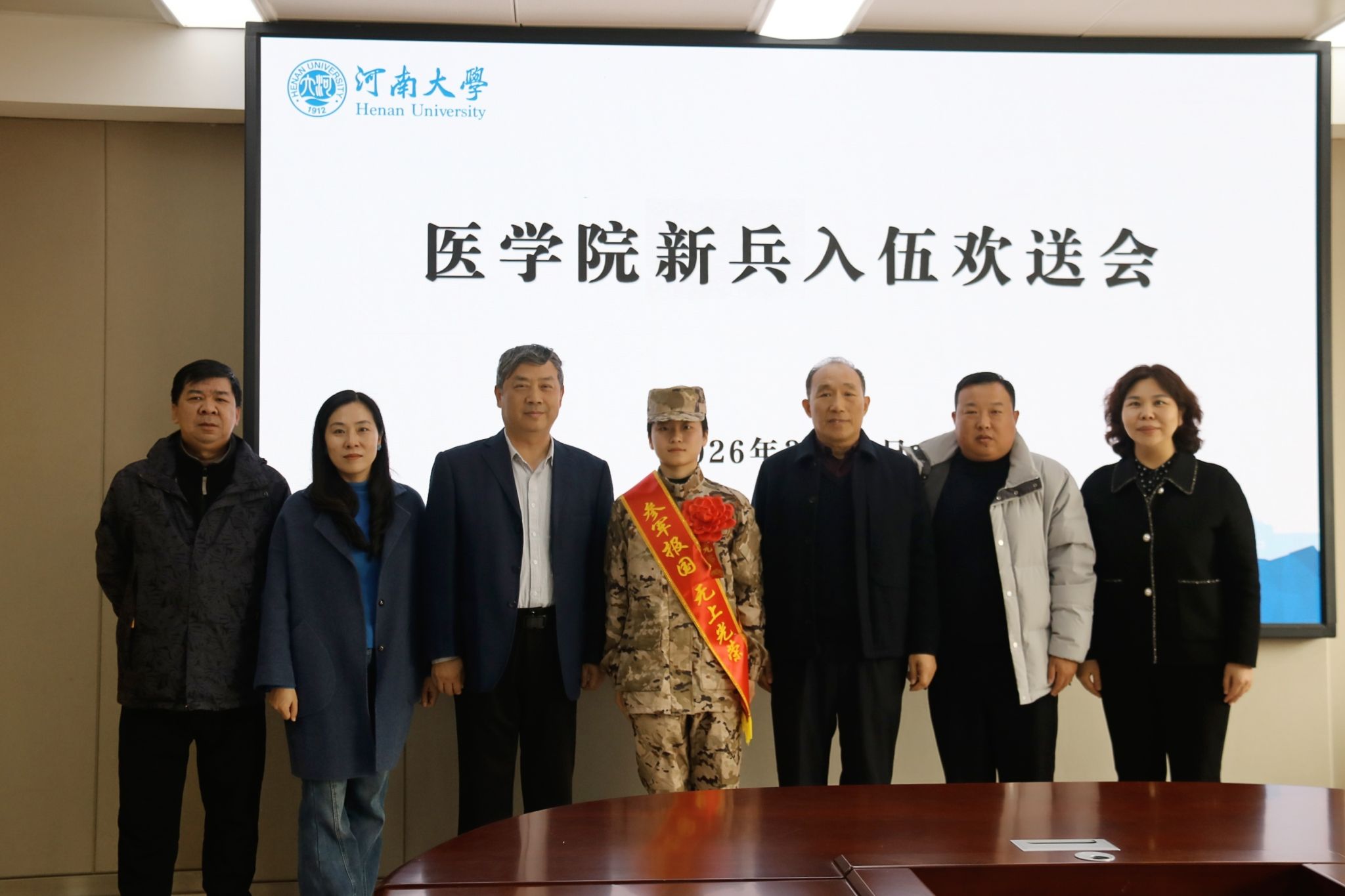 风华正茂抒壮志,参军报国正当时。3月19日,医学院在金明校区曾宪梓楼二楼会议室举行2026年春季新兵入伍欢送会,共同欢送2025级临床医学专业本科生万小雨光荣入伍。校保卫处处长、人民武装部部长张霖,保卫处副处长、人民武装部副部长王赛之,医学院党委常务副书记王莹,医学院学生工作组组长、校医院党总支书记、院长陈丹丹及新兵家长、校人民武装部相关人员、全体本科生辅导员、2025级临床医学专业学生代表出席本次会议。会议由陈丹丹主持。