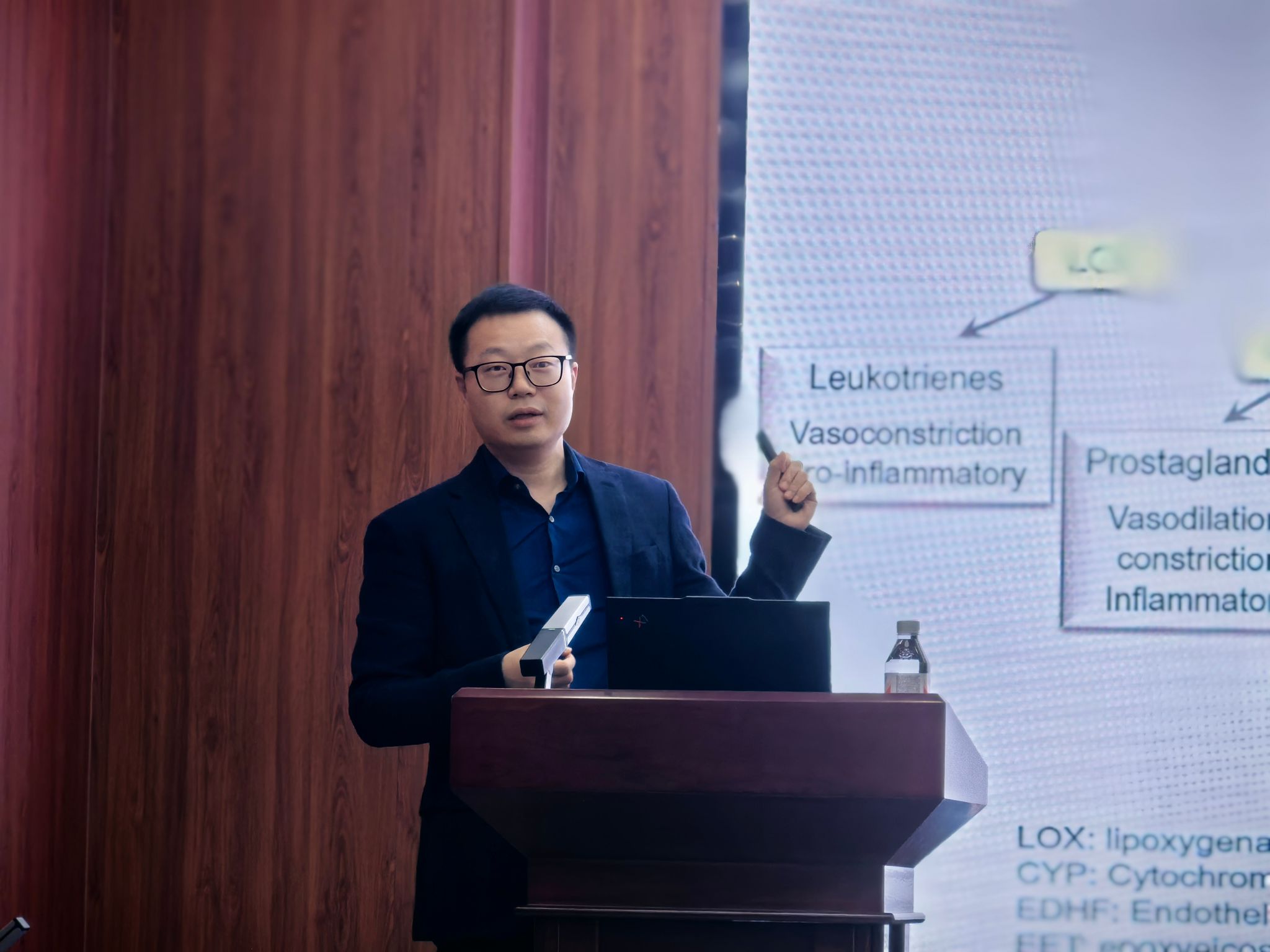 报告中,胡炅系统介绍了多不饱和脂肪酸代谢在维持血管稳态中的关键作用,并深入探讨了该代谢通路异常如何参与眼底血管稳态和阿尔茨海默症的发生发展。他从脂代谢调控、血管功能重塑到中枢神经系统病理改变,层层递进地揭示了多不饱和脂肪酸代谢中的sEH水解酶在血管稳态与神经退行性疾病中的重要作用。